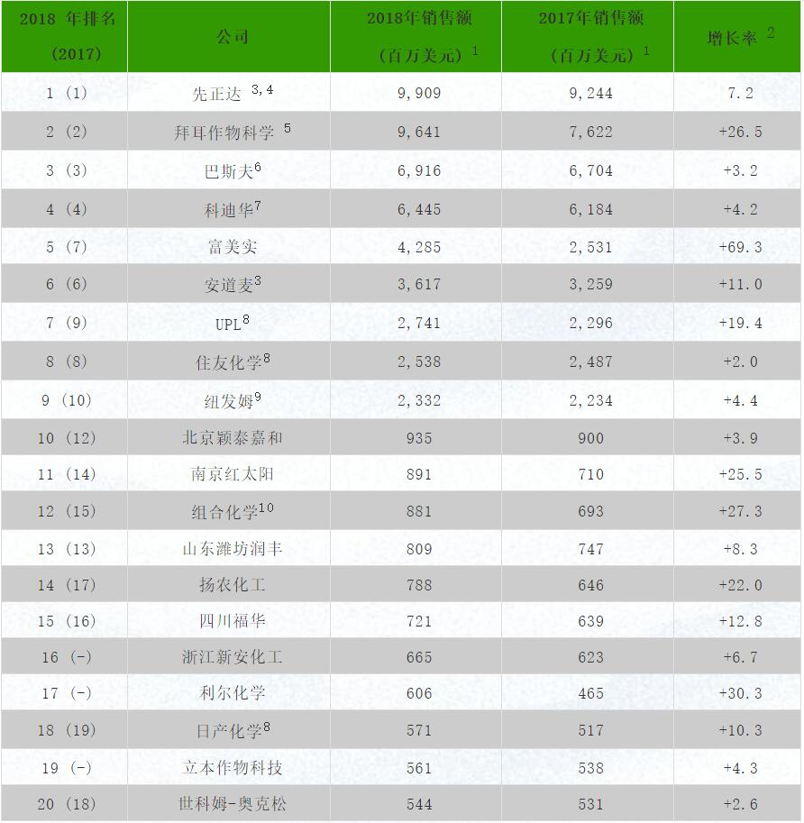注:1. 根据相应财年原始报告货币兑美元的年平均汇率换算得出;2. 以美元计的销售额的同比变化率;3. 已归属中国化工集团;4. 不包括草坪园艺植保业务及种子和性状业务的销售额;5. 不包括种子处理剂的销售额及环境科学业务的销售额;6. 不包括种子和性状业务的销售额;7. 2017年形式上的销售额(假设2016年1月1日杜邦和陶氏化学完成合并),不包括种子和性状的销售额;8. 2018 和2017财年的销售数据分别截止于2018 和2017 年的3 月31 日;9. 2018和2017财年的销售数据分别截止于2018 和2017年的7 月31 日;10. 2018 和2017 财年的销售数据分别截止于2018和2017年的10 月31 日。来源:世界农化网