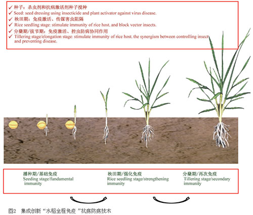 经过多年的试验示范,宋宝安教授总结出“以作物健康为目标,通过合理搭配生长环境要素,水稻全程生长的全程一体化综合管护措施”,降低了水稻生长发育全过程的病虫害发生。该措施以激发植物免疫体系为核心,以毒氟磷、氨基寡糖素等植物免疫调控剂为基础,通过植物免疫激活剂的施用促进水稻健壮、防病、抗病和丰产。该技术压低了病虫害发生基数,降低了病虫害的繁殖率和种群数量,保护了自然天敌、发挥了自然控制作用,降低了化学防治次数、减少了农药用量,集成创新全程免疫防控技术与绿色防控技术,实现了防治技术的简化、防治效果的提高、防治成本的降低、农田生态的改善。通过“三位一体”模型实现了“虫病共防”的全程免疫防控(图2)。