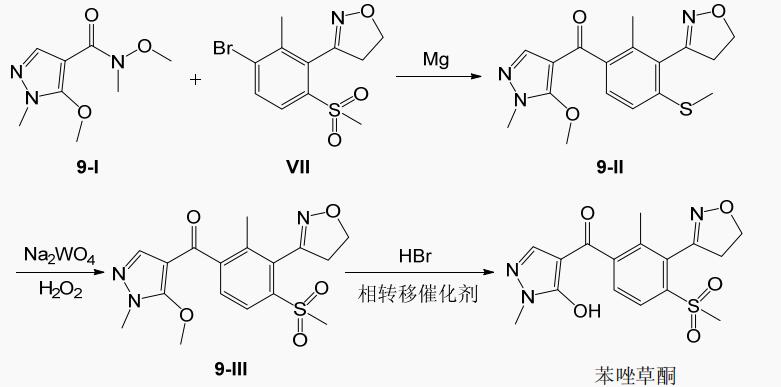 与上述合成路线不同的是,该合成路线设计了新的中间体N,5-二甲氧基-N,1-二甲基-1H-吡唑-4-甲酰胺(9-Ⅰ),使其与3-[3-溴-2-甲基-6-(甲基磺酰基)苯基]-4,5-二氢化异噁唑(Ⅶ)格氏试剂反应合成了[3-(4,5-二氢-1,2-噁唑-3-基)-4-甲基磺酰基-2-甲苯基](5-甲氧基-1-甲基吡唑-4-基)甲酮(9-Ⅱ),再经氧化、去甲基化最终合成苯唑草酮。该合成路线在新的中间体的合成过程中需要增加反应步骤,且涉及多步保护、脱保护过程,工艺过程较为繁琐。
