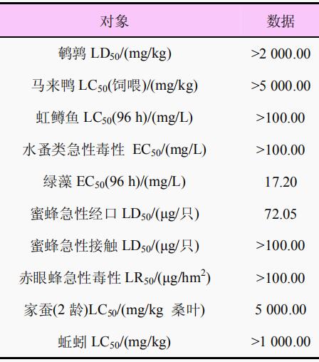 苯唑草酮对哺乳类动物、鸟类、鱼类、微生物、昆虫等低毒,但对藻类有一定的毒性,其毒性数据见表1和表2。