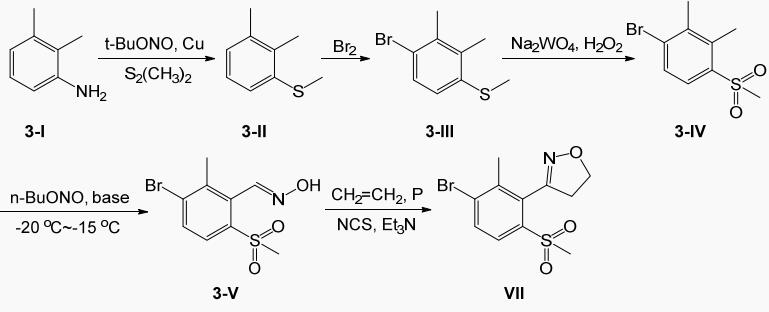 2,3-二甲基苯胺(3-Ⅰ)经重氮化反应将氨基置换为甲硫基,再经溴化、氧化、肟化和1,3-偶极环加成反应制备了关键中间体3-[3-溴-2-甲基-6-(甲基磺酰基)苯基]-4,5-二氢化异噁唑(Ⅶ)。