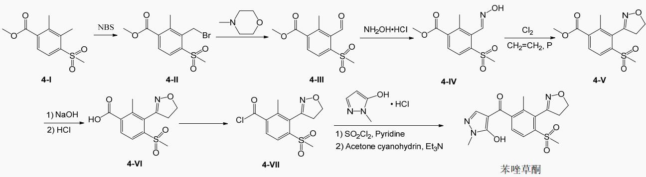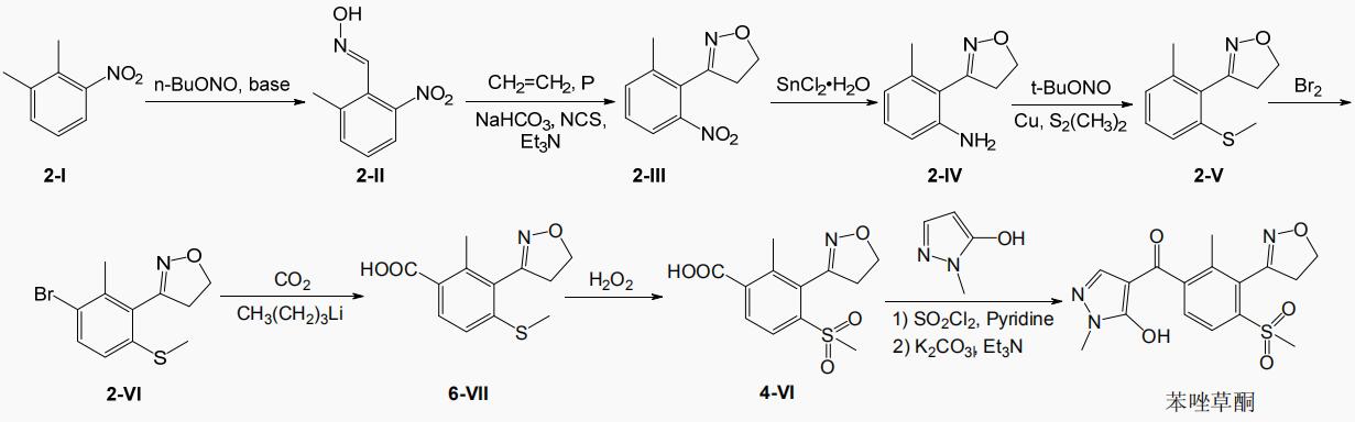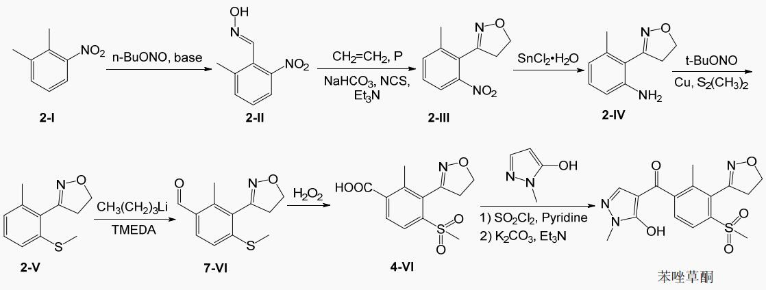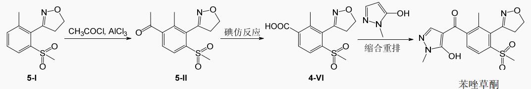 该方法通过乙酰化、碘仿反应生成3-(2-甲基-6-甲磺基苯甲酸)-4,5-二氢化异噁唑(4-Ⅵ),最后通过和1-甲基-5-羟基吡唑的缩合重排制得苯唑草酮。其中省去了溴化、CO气体插羰反应步骤,具有一定的工业化前景。