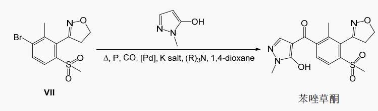 巴斯夫公司使用CO插羰法合成了苯唑草酮,总的反应式见图1。