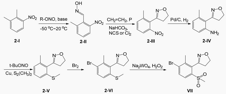 3-硝基邻二甲苯(2-Ⅰ)经肟化合成2-甲基-6-硝基苯甲醛肟(2-Ⅱ),再原位生成氧化腈与乙烯发生1,3-偶极环加成反应生成3-(2-甲基-6-硝基苯)-4,5-二氢化异噁唑(2-Ⅲ),然后硝基进一步加氢还原成氨基,再通过重氮化反应将氨基转换成甲硫基生成3-(2-甲基-6-甲基硫代苯基)-4,5-二氢化异噁唑(2-Ⅴ)。在此基础上溴化得到3-(3-溴-2-甲基-6-甲基硫代苯基)-4,5-二氢化异噁唑(2-Ⅵ),最后通过氧化反应得到上述关键中间体(Ⅶ)。