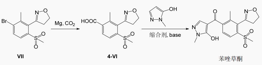 将 3-[3-溴-2-甲基-6-(甲基磺酰基)苯基]-4,5-二氢化异噁唑(Ⅶ)制成格氏试剂,再与CO2反应合成3-(2-甲基-6-甲磺基苯甲酸)-4,5-二氢化异噁唑(4-Ⅵ),进而制备苯唑草酮。