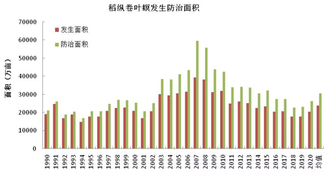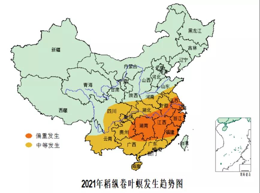 2021年稻纵卷叶螟在江南、西南东部和长江下游稻区将偏重发生,华南、西南西部和江淮稻区中等发生。预计全国发生面积为2.1亿亩次,防治面积为2.5亿亩次。