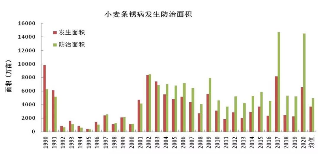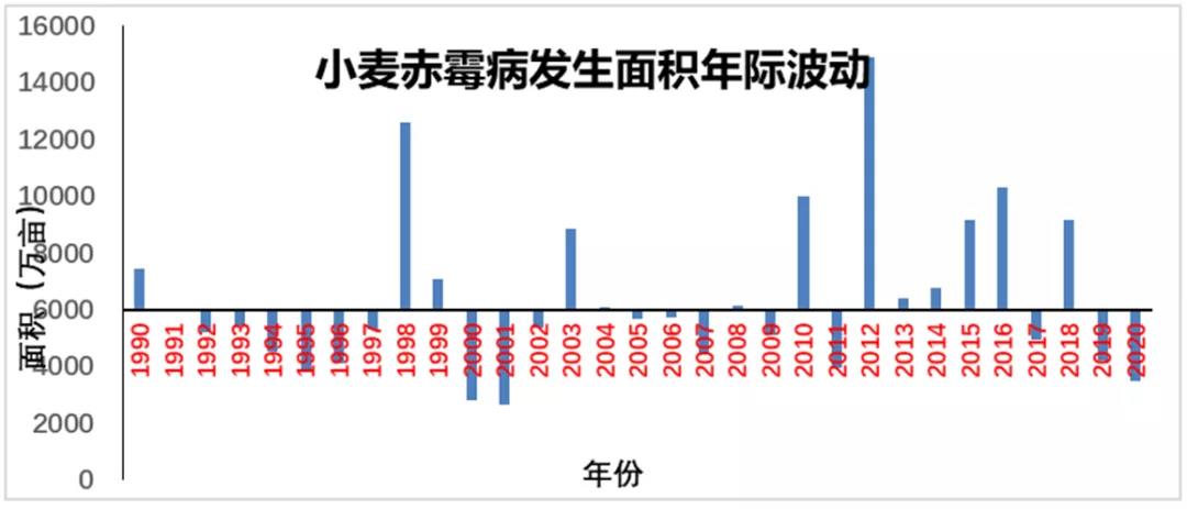 小麦赤霉病是典型的气候型病害,发生面积在年际间剧烈波动。2001—2010年的10年年均发生面积为6,000万亩左右,2011—2020年的10年年均发生面积为7,300万亩左右。即近10年来,赤霉病大流行频率明显提高。