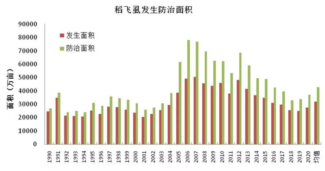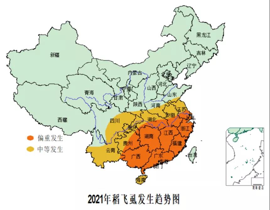 2021年稻飞虱在华南、江南和长江中下游稻区将偏重至大发生,南方其他稻区中等发生。预计全国发生面积为3.5亿亩次,防治面积为4.5亿亩次。