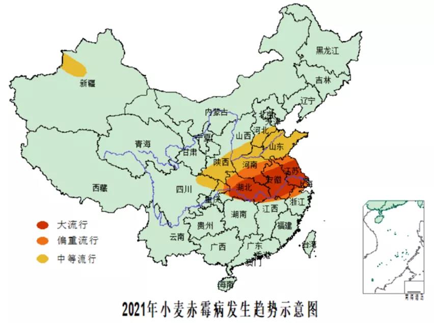 由于近年来小麦与稻/玉米长期轮作,田间菌源丰富,品种普遍不抗病,常发区抽穗扬花期易遇连阴雨天气,2021年小麦赤霉病在长江中下游、江淮麦区将大流行,在黄淮南部麦区偏重流行,其他麦区中等流行。预计全国流行面积9,000万亩,需预防控制面积为2亿亩次。