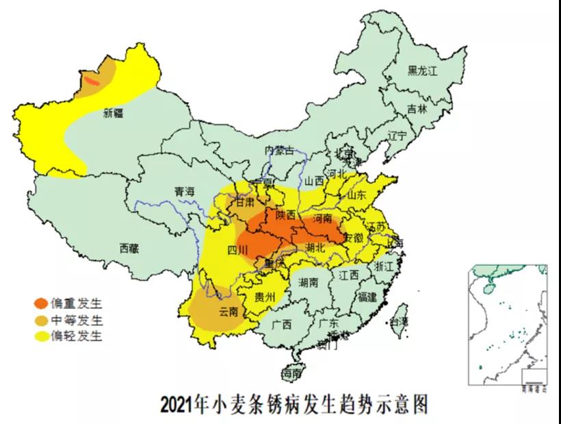 由于甘肃陇南等地秋苗发病早而普遍,湖北、河南南部冬季气温正常或偏高,有利于病害冬繁,2021年小麦条锈病将总体偏重发生,重发区域主要在湖北和陕西大部、河南中南部、甘肃南部、四川沿江沿河流域、新疆伊犁河谷和塔城盆地等麦区。预计全国发生面积为6,000万亩,防治面积为7,000万亩次。