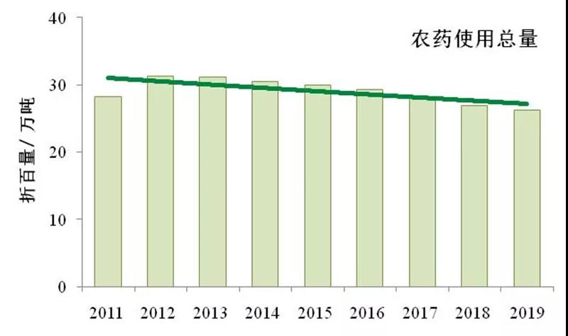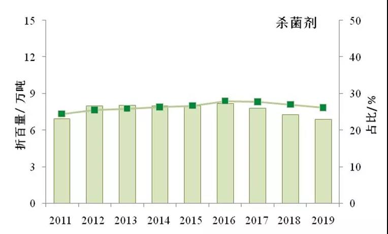 近年来,化学农药使用的总用量持续下降。2011—2019年农药使用总量(折百量)由31.3万吨下降到26.3万吨。各大类使用量各有变化:2011—2019年杀虫剂、杀菌剂、除草剂三大类使用量合计占比由96.0%下降到94.5%;其中,杀虫剂占比由40%下降到27%,杀菌剂占比由24%增长到26%~27%,除草剂占比由31%增长到41%;封闭除草、拌种药剂类的农药品种使用量上升明显。