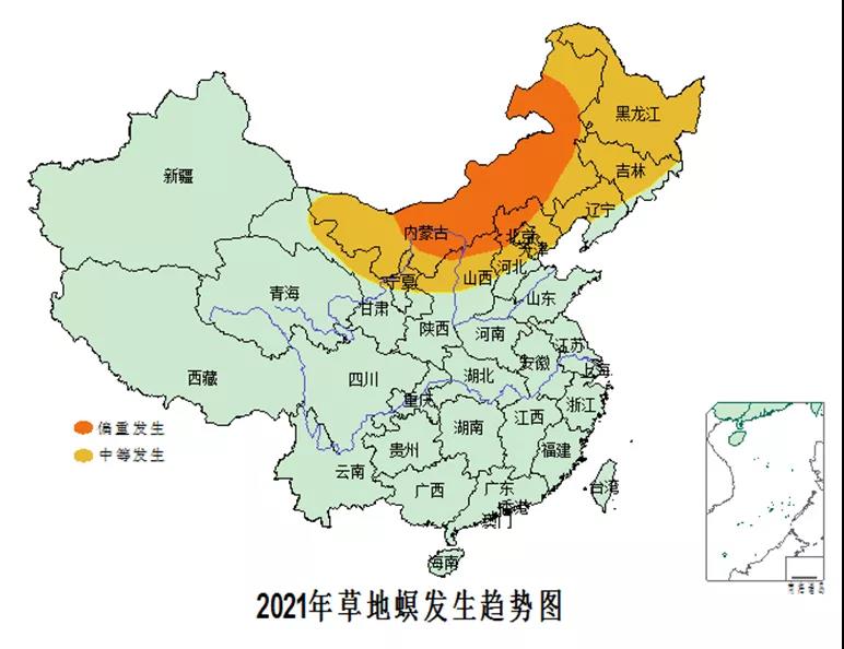 内蒙古多地查到越冬茧,四子王旗等地虫源量较高;蒙古、俄罗斯等境外虫源区有大规模迁入可能。2021年内蒙古及其周边重发可能性大。预计全国成虫发生面积可达5,000万亩,幼虫发生面积3,000万亩,需防治面积5,000万亩次。