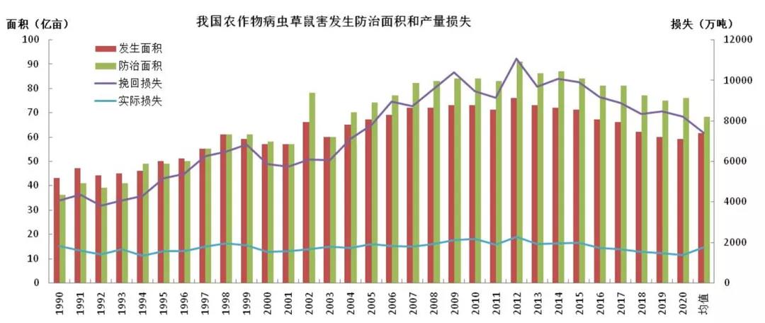 从全局来看,由于病虫害发生基数高,作物布局、种植制度和气候条件总体有利,2021年我国农作物主要病虫害仍维持重发态势。其中,草地贪夜蛾、水稻“两迁”害虫、草地螟等迁飞性害虫,小麦赤霉病、小麦条锈病、稻瘟病、马铃薯晚疫病等流行性病害对粮食生产威胁大。预计全国农作物病虫草鼠害发生面积可达62亿亩次,防治面积可达70亿亩次。