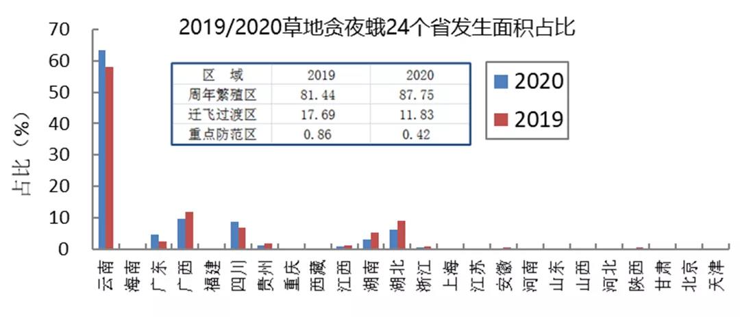 根据2019—2020的全国大范围监测调查结果,草地贪夜蛾在我国的发生为害仍具有明显的区域性。从发生面积看,西南、华南等周年繁殖区,发生面积占比在80%以上,长江中下游、江淮等迁飞过渡区,发生面积占1~2成,北方重点防范区发生面积占比不足1%。