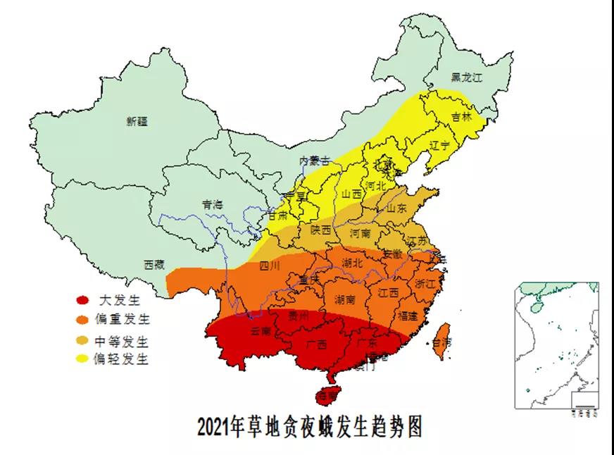 预计2021年草地贪夜蛾在西南、华南、长江中下游和江淮地区呈重发态势,需重点防控;南方成虫发生期,遇适宜的东亚季风或台风事件,可助力虫源北迁,西北、黄淮、华北和东北需加强防范;预计全国发生面积为2,000万亩以上,防治面积为3,000万亩次以上。