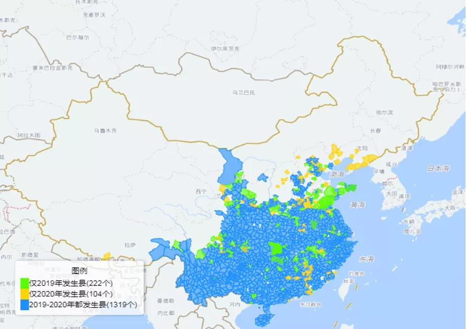 从发生县点分布看,2019—2020年见虫县共计1,645个,2019年有26个省1,541个县,2020年有27个省1,423个县,两年均发生县占发生县数的80%。