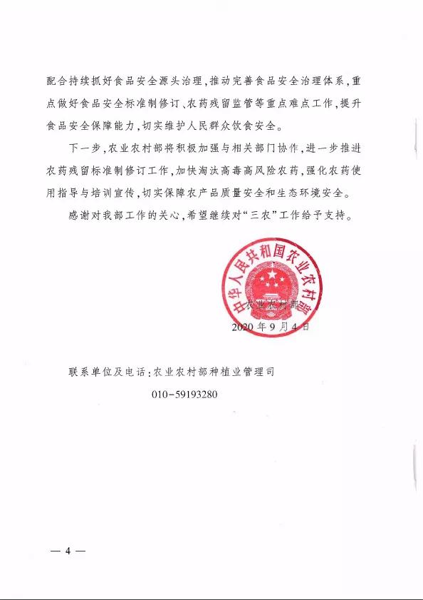 近日,农业农村部在针对王明珠、张勇委员提出的“关于进一步加强农药残留监管,禁用和淘汰高毒农药的提案”的提案(关于政协十三届全国委员会第三次会议第4905号(农业水利类375号)提案答复的函)答复如下: