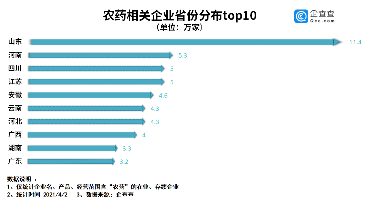 从地区分布来看,企查查数据显示,山东省目前以11.4万家的农药相关企业数量高居第一,是第二名河南(5.3万家)的两倍有余,而紧随其后的四川与江苏同样有5万家。此外,安徽、云南、河北、广西等省份跻身前十。
