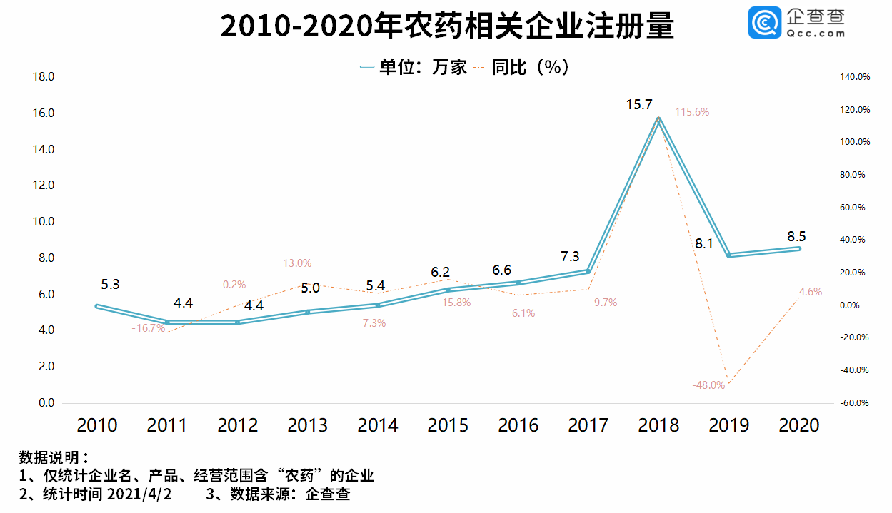 从十年行业变化来看,企查查数据显示,农药相关企业年注册量在2018年达到15.7万家的最高峰,随后两年均为8万余家,其中2020年新增企业8.5万家,同比增长4.6%。