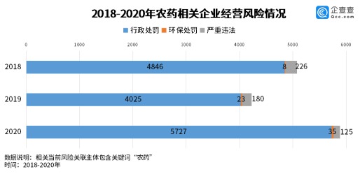 从农药行业的企业经营风险数据来看,企查查数据显示,2020年全行业共新增行政处罚5727条,同比增长42.3%。此外,2020年新增环保处罚35条,严重违法125条。