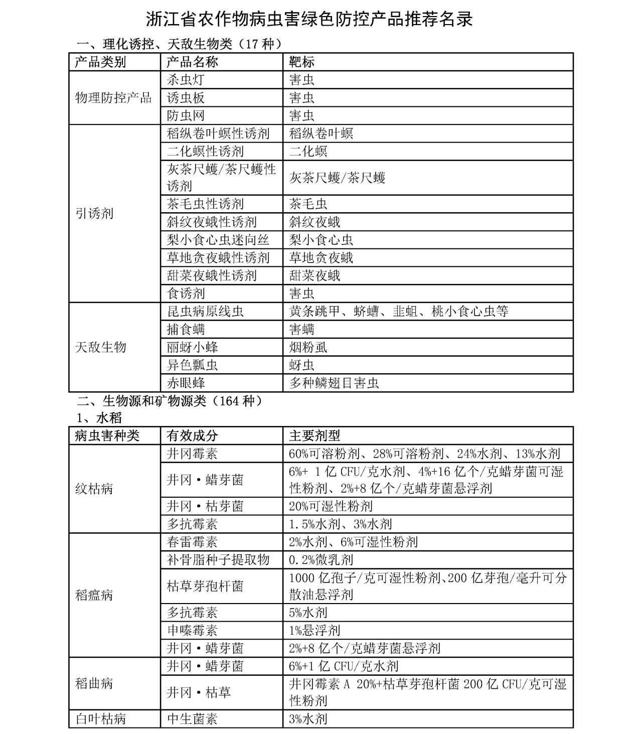 近日,浙江省农业农村厅发布关于浙江省农作物病虫害绿色防控产品推荐名录的公示。详细内容如下: