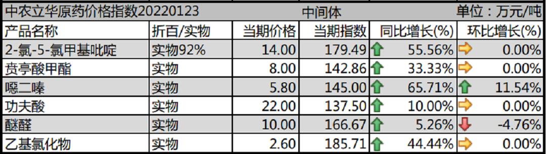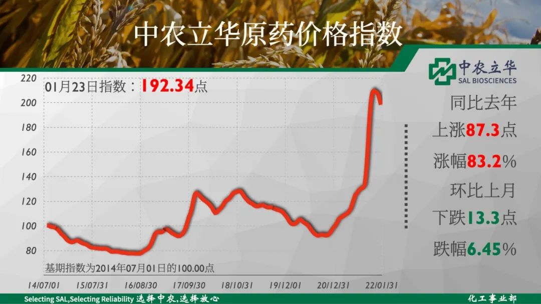 2022年01月23日,中农立华原药价格指数报192.34点,环比上月下跌6.45%;跟踪的上百个产品中,同比去年,90%的品种上涨,环比上月,47%的产品冲高回落。