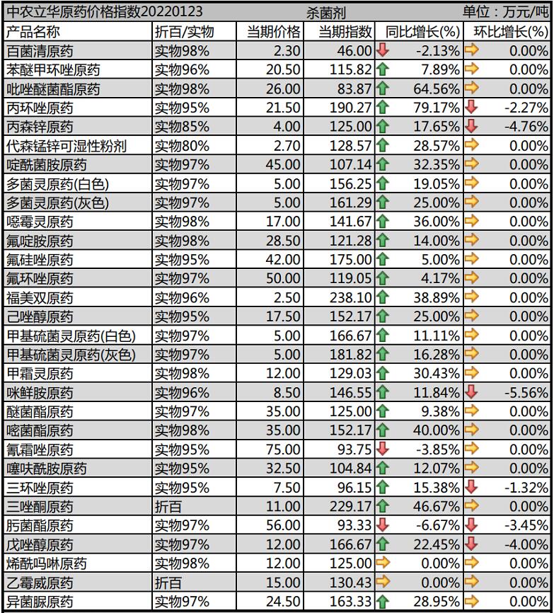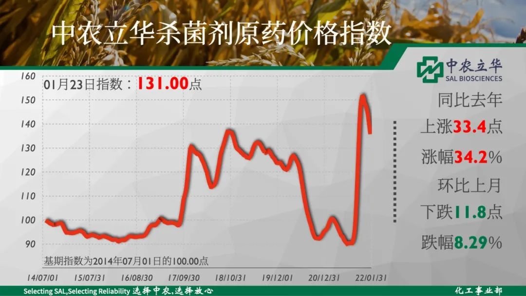2022年01月23日中农立华杀菌剂原药价格指数报131.00点,环比上月下跌9.20%。