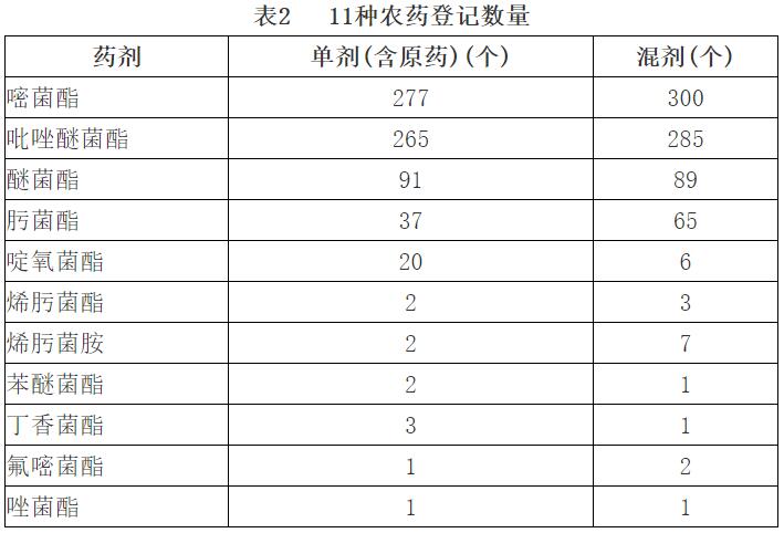 2.2 9种农药登记用量情况由于氟嘧菌酯和唑菌酯2种杀菌剂仅登记了原药信息,所以仅对嘧菌酯、吡唑醚菌酯、醚菌酯、肟菌酯、啶氧菌酯、烯肟菌酯、烯肟菌胺、苯醚菌酯、丁香菌酯等9种杀菌剂单剂进行分析。
