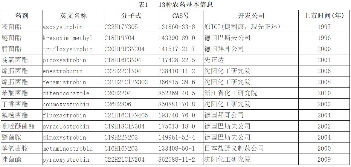 甲氧基丙烯酸酯类杀菌剂是以天然抗生素Strobilurin A为先导化合物开发的一类新型杀菌剂。原ICI(捷利康,现先正达)开发了全球第1个甲氧基丙烯酸酯类杀菌剂——嘧菌酯,醚菌酯、肟菌酯等甲氧基丙烯酸酯类杀菌剂也被陆续开发,新近开发的是浙江省化工研究院的苯醚菌酯。经过多年发展,甲氧基丙烯酸酯类杀菌剂共有13个品种商品化,已经在杀菌剂市场占有非常重要的地位(表1)。