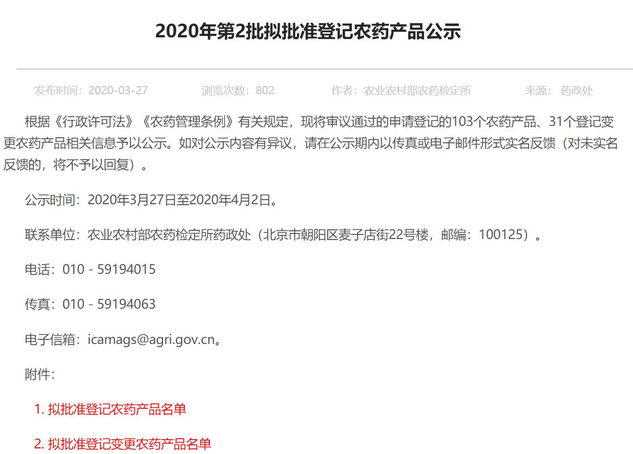 2020年3月27日,农业农村部农药检定所公示了2020年第2批拟批准登记农药产品名单。其中包括审议通过的申请登记的103个农药产品、31个登记变更农药产品相关信息。