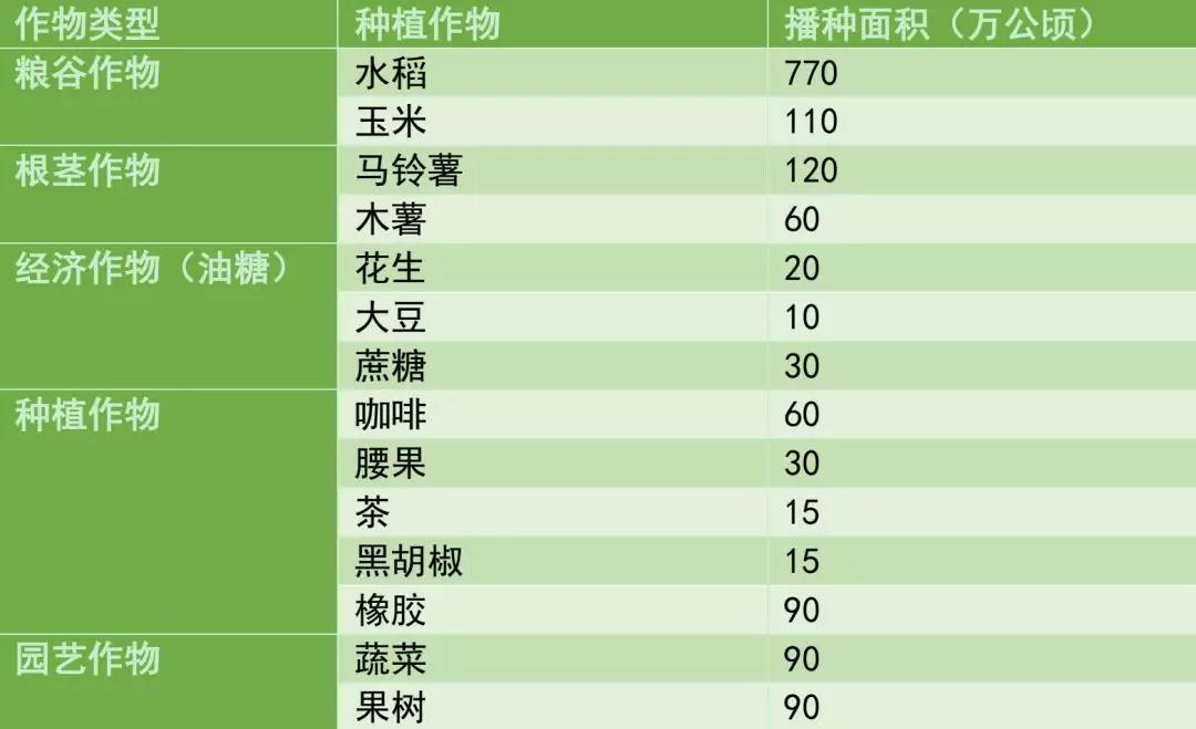 1 越南农作物种植和农药使用概况越南农药进口和制剂加工总量约为每年10万吨(实物量),其中除草剂占37%,杀虫剂和杀菌剂各占25%,其它类型产品占13%。每年总用量为5.4万吨,1万吨用于熏蒸,3.6万吨出口到其它国家。越南耕地面积为1 150万公顷,农作物总播种面积1 510万公顷,其中水稻是播种最多的作物,占越南所有作物播种面积的一半以上(表1)。