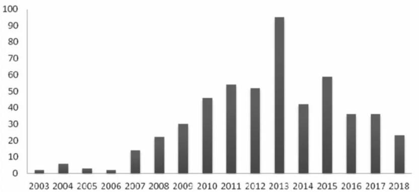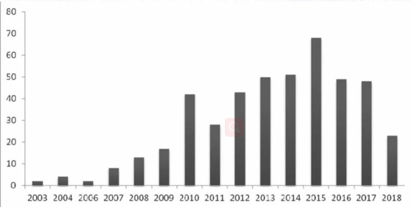 国外申请趋势方面,可以将2003—2018年间专利申请量变化分为如下三个阶段:(1)探索萌芽期:2003—2006年;(2)迅猛增长期:2007—2013年;(3)稳定发展期:2014—2018年(图3)。
