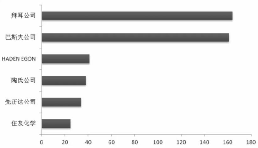 国外申请人方面,拜耳公司的申请量排名首位,如此高的申请量显示出了拜耳公司在氟吡菌酰胺领域的显著优势。除了拜耳公司,巴斯夫公司的申请量排名第二,巴斯夫是德国著名的农药企业,具有很强的研发能力。此外,陶氏、先正达和住友化学公司也有较多有关氟吡菌酰胺的专利申请(图5)。