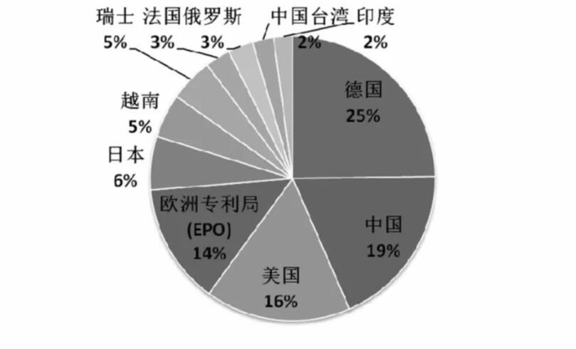 1.3 全球专利申请地域分析氟吡菌酰胺的专利申请主要来自德国,占全球该领域总申请量的25% ,主要是由于拜耳和巴斯夫公司在氟吡菌酰胺领域的占据大多数申请量。排名第二的国家是中国,占据全球申请量的19%,说明国内申请人看到了氟吡菌酰胺的市场潜力,重视氟吡菌酰胺的专利布局(图6)。