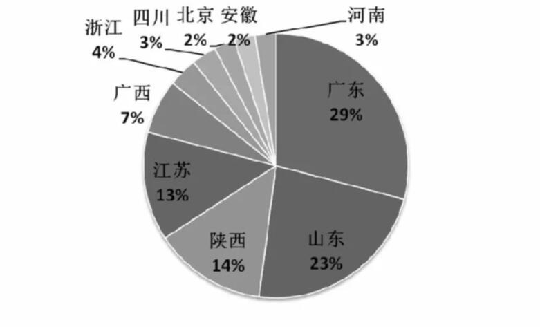 1.4 国内各省市申请量申请量排名靠前的分别是广东、山东、陕西和江苏。其中,广东的申请量占比达到了29%,排名第一,这主要是由于广东中迅农科、深圳诺普信农化、广州市真格农业、佛山市普尔玛农化等国内知名农药企业分布在广东。山东、陕西和江苏的申请 量紧随其后,分别占比在23%、14%和13%以上。广西和浙江的申请量排名为第5和第6,分别占比在7% 和4% 。其它各省市自治区的竞争力稍显不足(图7)。