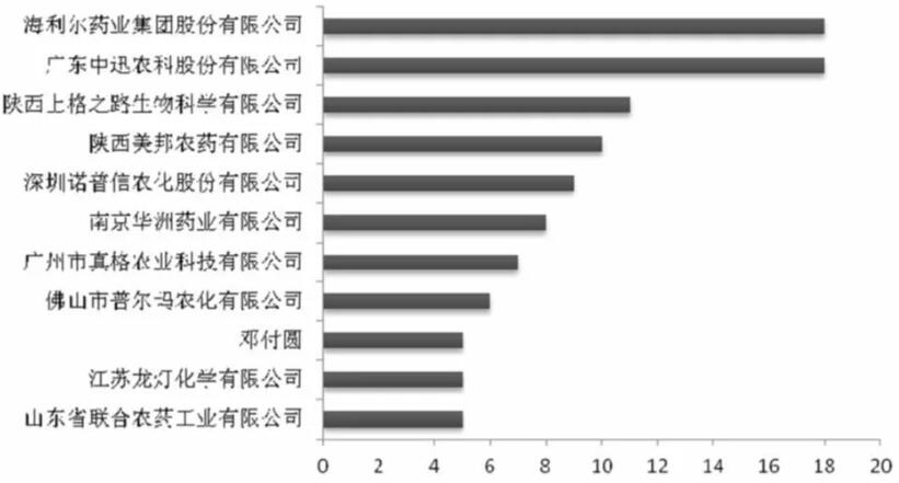 1.2 重点申请人国内申请人集中在企业,在排名前十一的申请人中,十位为农药企业,海利尔药业集团和广东中迅农科公司的申请量最大,从专利申请量整体分布来看,我国专利申请较为分散、不够集中,大多数企业的申请量较低,缺乏像拜耳、巴斯夫等行业领先企业,反映了我国农药的科研实力距离国外先进企业还有一段距离(图4)。