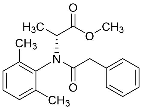 叶菌唑作为一种新型广谱内吸性杀菌剂,兼具优良的保护及治疗作用。叶菌唑主要用于防治麦类作物的壳针孢、穗镰刀菌、叶锈病、条锈病、白粉病和颖枯病,尤其对壳针孢属和锈病活性优异,对小麦的颖枯病特别有效。叶菌唑作用机理与其他三唑类杀菌剂雷同,但活性谱则差别较大,与其它脱甲基抑制剂无交互抗性,既可茎叶处理又可种子处理[8]。吴羽具有优先权的化合物专利是JP198833773。江苏辉丰生物农业股份有限公司在国内登记了95%叶菌唑原药, 50%叶菌唑水分散粒剂和8%叶菌唑悬浮剂,水分散粒剂用于防治小麦的白粉病和锈病,制剂用量9~12 g/亩,悬浮剂用于防治小麦赤霉病,制剂用量56~75 mL/亩。1.8 精苯霜灵 精苯霜灵早在上世纪80年代就被报道,意大利的意赛格进行了商业开发,英文通用名:Benalaxyl-M,CAS登记号:98243-83-5,分子式:C20H23NO3,相对分子质量:325.40,化学结构式如下: