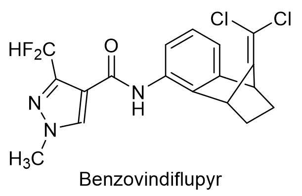 吡噻菌胺由三井、杜邦、曹达和先正达开发,具有良好的渗透和内吸性,有良好的预防和治疗作用。作为第一个广谱的珀酸脱氢酶抑制剂类杀菌剂,吡噻菌胺可以防治由白粉菌属、葡萄孢属、链格孢属、壳二孢属、丝核菌属和黑星菌属等病原菌引起的病害,如锈病、菌核病、灰霉病、白粉病、茎腐病和褐斑病等,果树上的黑星病和斑点落叶病等,以及草坪的炭疽病和币斑病等,可用于油菜、谷物、蔬菜、果树、坚果树、观赏植物、马铃薯、向日葵、草坪和其他大田作物上多种病害的防治[4]。日本三井化学农业株式会社具有优先权的化合物专利是JP199585601。日本三井在国内 登记了99%吡噻菌胺原药和20%吡噻菌胺悬浮剂(商品名:克必拿),由世科姆进行市场化运作,用于防治黄瓜白粉病和葡萄灰霉病,黄瓜白粉病用量25~33 mL/亩,葡萄灰霉病上的使用剂量是1500~3000倍稀释。1.4 苯并烯氟菌唑苯并烯氟菌唑是先正达开发的新型吡唑酰胺类杀菌剂,英文通用名:Benzovindiflupyr,研发代号:SYN545192,CAS登记号:1072957-71-1,分子式:C18H15Cl2F2N3O,分子量:398.23, 化学结构式如下: