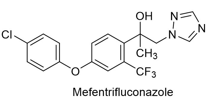 苯并烯氟菌唑具有优异的内吸传导性,能够紧密结合植物的蜡质层,缓慢渗透到植物组织中,通过干扰真菌细胞的正常呼吸来抑制病原菌的生长,可抑制孢子萌发、菌丝生长和孢子形成。苯并烯氟菌唑具有广谱、高效和持效期长的特性,叶面喷雾或土壤处理可防治多种作物、草坪和花卉的叶面病害和土壤病害,对小麦全蚀病、叶枯病和基腐病,花生黑斑病等防效良好,对大豆亚洲锈病具有杰出防效,对玉米小斑病、灰霉病,小麦白粉病有特效,可以防治块茎植物的早疫病,马铃薯黑痣病,豆类的叶斑病、炭疽病、斑枯病、灰斑病、荚秆枯腐病和白粉病等[5]。先正达具有优先权的化合物专利是EP05023222。先正达开发的苯并烯氟菌唑·嘧菌酯混剂(商品名:Elatus),是大豆锈病防治领域的明星产品,在国内登记了96%苯并烯氟菌唑原药和45%苯并烯氟菌唑·嘧菌酯水分散粒剂,其水分散粒剂产品在观赏菊花白锈病上剂量为制剂稀释1700~2500倍,防治花生锈病剂量为制剂17~23克/亩。1.5 氯氟醚菌唑氯氟醚菌唑是巴斯夫公司开发的新型三唑类杀菌剂,英文通用名:Mefentrifluconazole, CAS登记号:1417782-03-6,分子式:C18H15ClF3N3O2,相对分子质量:397.78,化学结构式如下: