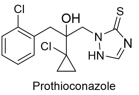 氯氟醚菌唑是甾醇生物合成中的C14-脱甲基化抑制剂,是巴斯夫具有划时代意义的新产品。氯氟醚菌唑具有广谱、高效和内吸传导性的特性,兼具保护、治疗、铲除作用,具有良好的速效性和持效性,可防控许多壳针孢菌引起的真菌病害,对壳针孢菌的活性优于同类产品,适用于大田作物如玉米、谷物、大豆、水稻等,经济作物青椒、葡萄等世界范围内的60多种作物,也可以用于草坪和观赏植物。氯氟醚菌唑既可叶面喷雾,也能用于种子处理[6]。巴斯夫具有优先权的化合物专利是EP2011173846。巴斯夫在国内登记了97%氯氟醚菌唑原药和锐收®系列产品,锐收®系列产品包括400克/升氯氟醚菌唑悬浮剂,用于防治苹果褐斑病,制剂稀释3000~6000倍;400克/升氯氟醚菌唑·吡唑醚菌酯悬浮剂,用于防治葡萄炭疽病和番茄早疫病,葡萄炭疽病是制剂稀释1500~2500倍,番茄早疫病是制剂20~40 mL/亩;240克/升氯氟醚菌唑·吡唑醚菌酯乳油,用于防治玉米大斑病,制剂用药量48~55 mL/亩。1.6 丙硫菌唑丙硫菌唑是拜耳开发的三唑硫酮类杀菌剂,英文通用名:Prothioconazole,CAS登记号:178928-70-6,分子式:C14H15Cl2N3OS,相对分子质量:344.26,化学结构式如下: