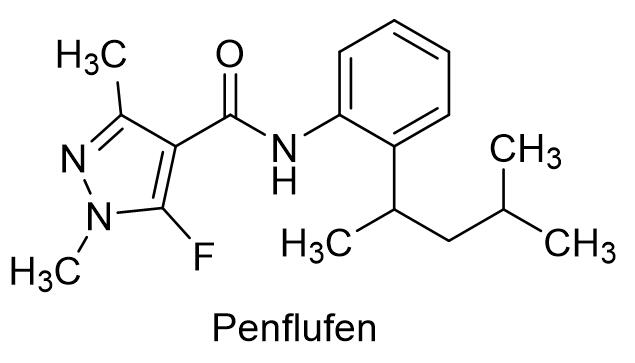 氟唑菌酰羟胺作为先正达上市的划时代意义的杀菌剂,具有广泛的杀菌谱,对叶斑病和白粉病的活性达到新高度,对赤霉病高效,兼具杀线虫和促进植物健康的作用。氟唑菌酰羟胺突破了传统SDHI类的杀菌谱,可高效防治镰刀菌引起的病害,在作物上具有良好的渗透性和极佳的耐雨水冲刷能力。氟唑菌酰羟胺可以用于谷物、玉米、大豆、花生、油菜、藜麦、蔬菜、干豌豆、果树、特种作物、草坪和观赏植物等作物上面的多种病害防治[2]。先正达具有优先权的化合物专利是IN2008DE2764。先正达在国内登记了单剂产品200 克/升氟唑菌酰羟胺悬浮剂(商品名:麦甜®),用于防治小麦赤霉病和油菜菌核病,制剂用量50~65 mL/亩,也登记了混剂产品200 克/升氟唑菌酰羟胺·苯醚甲环唑悬浮剂(商品名:美甜®),用于防治黄瓜白粉病和西瓜白粉病,制剂用量40~50 mL/亩。1.2 氟唑菌苯胺氟唑菌苯胺是拜耳发现的吡唑酰胺类杀菌剂,英文通用名:Penflufen,CAS登记号:494793-67-8,分子式:C18H24FN3O,分子量:317.40,化学结构式如下: