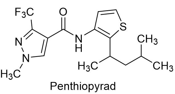 氟唑菌苯胺是拜耳推出的市值上亿美元的重要杀菌剂,可防治担子菌和子囊菌等病原菌引起的病害,兼具内吸、预防和治疗作用,持效期长,主要用于种子处理。氟唑菌苯胺可高效保护玉米、大豆、油菜、马铃薯、棉花、花生、洋葱和豆类等植物的幼苗免遭由担子菌中的立枯丝核菌引起的种传和土传病害,还可以有效防治谷类作物上由黑粉菌、丝核菌和旋孢腔菌等引起的病害[3]。拜耳具有优先权的化合物专利是DE200110136065,拜耳在国内登记了95%氟唑菌苯胺原药和22.4%氟唑菌苯胺种子处理悬浮剂(商品名:阿马士),阿马士通过薯种包衣防治马铃薯黑痣病,有效成分用量为1.76~2.64 g/100 kg种薯,拜耳也将其扩展用于防治水稻纹枯病和恶苗病,制剂用药量为200~300 g/100 kg种子。1.3 吡噻菌胺吡噻菌胺是日本三井化学农业株式会社发现的吡唑酰胺类杀菌剂,英文通用名:Penthiopyrad,CAS登记号:183675-82-3,分子式:C16H20F3N3OS,分子量:359.41,化学结构式如下: