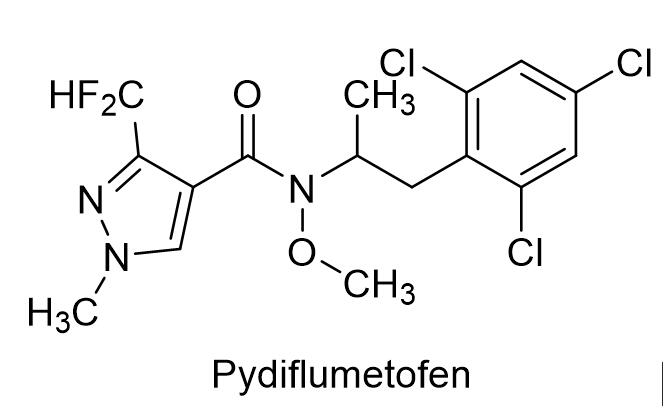 面对新化合物开发难度增大和日益严格的环保要求,为降低产品开发成本,优化产品组合的形势,农化行业掀起了兼并重组的浪潮,合并后的公司以及行业排名靠前的公司拥有相对完善的产品线,对农药品种的登记需求降低。我国新的《农药管理条例》和新的《农药登记资料要求》新增很多农药安全性方面的要求,更加严格的登记要求提高了农药登记的门槛,导致农化企业,尤其是中小型企业的登记风险和登记成本显著增加。农化行业对产品登记变得更加谨慎,我国2019年获得正式登记的农业用途农药较过去5年显著减少至264个, 2018年4326个,2017年3358个,2016年1627个,2015年2669个[1]。2019年新登记的264个产品中涉及化学原/母药26个,其中23个化学原/母药为首次正式登记,也有11个生物农药获得首次正式登记,本文将对这些新登记的品种进行介绍。1. 杀菌剂2019年登记的杀菌剂共100个,涉及化学原药14个,其中12个品种是国内首次正式登记,涉及4个生物杀菌剂母药,其中3个是国内首次正式登记,此外还有4个生物杀菌剂以单剂的形式首次获得正式登记。新登记的化学杀菌剂品种包括近年来热门的琥珀酸脱氢酶抑制剂类,有氟唑菌酰羟胺、氟唑菌苯胺、吡噻菌胺和苯并烯氟菌唑,麦角甾醇生物合成抑制剂的有氯氟醚菌唑、丙硫菌唑和叶菌唑,rRNA生物合成干扰剂精苯霜灵,纤维素合成酶抑制剂缬菌胺,作用机制尚不明确的环氟菌胺,胍类化合物多果定,以及新型杀线虫剂氟烯线砜。新登记的7个生物源杀菌剂包括互生叶白千层提取物、补骨脂种子提取物、侧孢短芽孢杆菌A60、β-羽扇豆球蛋白多肽、解淀粉芽孢杆菌LX-11、沼泽红假单胞菌PSB-S和盾壳霉ZS-1SB。 1.1 氟唑菌酰羟胺氟唑菌酰羟胺是先正达发现的新型酰胺类杀菌剂,英文通用名:Pydiflumetofen,CAS登记号:1228284-64-7,分子式:C16H16Cl3F2N3O2,分子量:426.67,化学结构式如下: