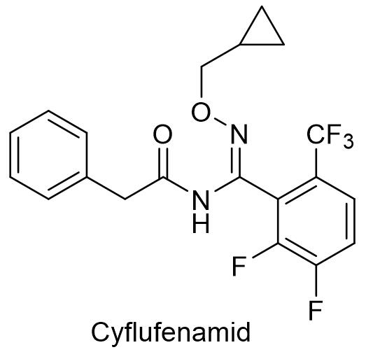 精苯霜灵主要通过抑制病原菌孢子的萌发和菌丝体的生长,兼具保护、治疗及铲除作用。精苯霜灵能够被植物根、茎、叶迅速吸收,并在植物体内传导到各个部位,包括生长点。精苯霜灵对卵菌门真菌具有高选择性和高活性,特别对霜霉科真菌,例如疫霉属、单轴霉属、假霜霉属、指梗霉属、盘霜霉属和腐霉属等具有良好防效,可以用于防治马铃薯和番茄等茄果类作物上的晚疫病,啤酒花、葡萄、莴苣、洋葱、大豆和烟草等作物上的霜霉病,以及疫霉属真菌引起的草莓疫病,观赏性植物疫病和腐霉属引起的草坪根腐病等[9]。精苯霜灵可作为叶面处理和种子处理。原汽巴-嘉基公司具有优先权的化合物专利是CH19942207。意大利意赛格公司登记了95%精苯霜灵原药和69%代森锰锌·精苯霜灵水分散粒剂,其水分散粒剂用于防治马铃薯晚疫病,制剂用量120~160克/亩。1.9 环氟菌胺环氟菌胺是日本曹达公司开发的新型酰胺类杀菌剂,英文通用名:Cyflufenamid,CAS登记号:180409-60-3,分子式:C20H17F5N2O2,相对分子质量:412.35,化学结构式如下: