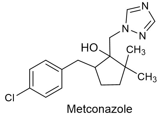 丙硫菌唑是新型C14-脱甲基化抑制剂,具有杀菌谱广、使用时机灵活、植物吸收迅速、良好的耐雨冲刷和持效期长等特性,集一身优良特性让其成为防治植物病害的新标杆。丙硫菌唑具有良好的内吸活性,优异的保护、治疗和铲除活性,并具有良好的安全性。丙硫菌唑主要用于防治花生、油菜、水稻、小麦、大麦、豆类、甜菜和大田蔬菜等作物上的众多病害,对小麦和大麦上的白粉病、纹枯病、枯萎病、叶斑病、锈病、菌核病、网斑病、云纹病等具有很好的防治效果,还可用于防治油菜和花生的土传病害,如菌核病,以及主要叶面疾病,相比传统的三唑类杀菌剂,丙硫菌唑具有更广泛的杀菌谱[7]。拜耳具有优先权的化合物专利是DE19944441354。安徽久易农业股份有限公司和山东海利尔化工有限公司登记了丙硫菌唑原药,久易农业登记了30%丙硫菌唑可分散油悬浮剂(商品名:久幺久®),用于防治小麦赤霉病,使用量40~45 mL/亩;海利尔登记了28%唑·多菌灵悬浮剂用于防治小麦赤霉病,用量117~133 mL/亩;江苏省溧阳中南化工有限公司登记了40%丙硫菌唑·戊唑醇悬浮剂,用于防治小麦的白粉病、锈病和赤霉病,使用量33~50 mL/亩。1.7 叶菌唑叶菌唑是吴羽化学工业发现的三唑类杀菌剂,英文通用名:Metconazole,CAS登记号:125116-23-6,分子式:C17H22ClN3O,相对分子质量:319.83,化学结构式如下: