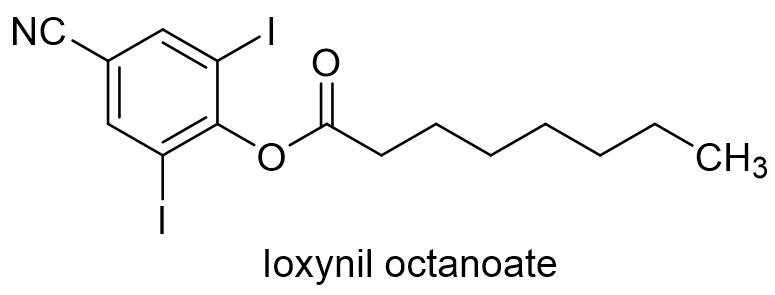 砜吡草唑属于超长链脂肪酸延长合成酶抑制剂类除草剂。砜吡草唑适用作物范围广,可用于小麦、玉米、花生、大豆、棉花等作物,在小麦田主要用于芽前封闭,以封杀禾本科杂草为主,阔叶杂草为辅,对鹅观草、多花黑麦草、雀麦、棒头草和蜡烛草等有优异的防效,对野燕麦、节节麦和鹅观草等的防效略差,对阔叶杂草大巢菜、播娘蒿、麦家公和泽漆有不同程度的防效。砜吡草唑对环境安全,对当茬作物和下茬作物安全,持效期可长达28天[23]。日本组合化学具有优先权的化合物专利是JP200131784。上海群力化工有限公司登记了98%砜吡草唑原药和40%砜吡草唑悬浮剂,悬浮剂用量25~30 mL/亩防治冬小麦田一年生杂草。3.7 辛酰碘苯腈May&Baker公司早在上世纪60年代开发了辛酰碘苯腈,英文通用名:Ioxynil octanoate, CAS登记号:3861-47-0,分子式:C15H17I2NO2,相对分子质量:497.11,化学结构式如下: