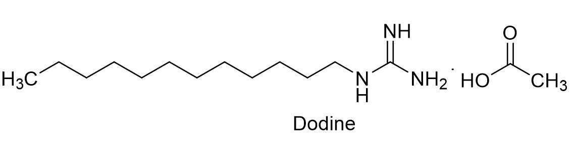 缬菌胺是纤维素合成酶抑制剂,对各种霉病有良好的防治效果,尤其对霜霉病有特效,主要应用在高价值经济作物上面。意赛格具有优先权的化合物专利是IT1998MI2583。比利时比尔清植保有限公司在国内登记了98%缬菌胺原药,富美实推出的66%缬菌胺·代森锰锌水分散粒剂,用于防治黄瓜霜霉病,制剂用量130~170 g/亩。1.11 多果定多果定的杀菌活性早在上世纪50年代就被报道,英文通用名:Dodine,CAS登记号:2439-10-3,分子式:C13H29N3·C2H4O2,相对分子质量:287.44,化学结构式如下: