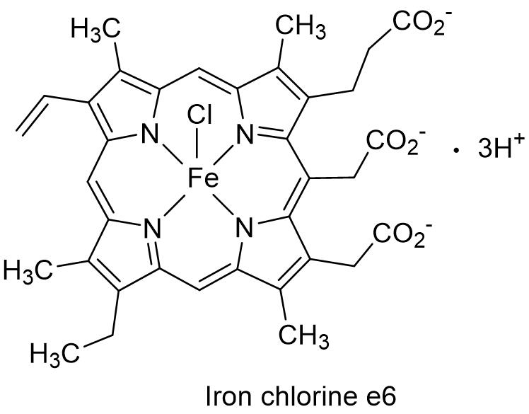 辛酰碘苯腈属于苯腈类除草剂,是具有一定内吸活性的触杀性除草剂,能被植物茎叶迅速吸收,通过抑制植物的电子传递、光合作用及呼吸作用而呈现出杀草活性,在植物体其他部位无渗透作用,在杂草幼期使用。辛酰碘苯腈对稻科和百合科等单子叶植物安全性高,对阔叶杂草有很高除草活性。辛酰碘苯腈在有光条件下才能表现出活性,除草活性与温度呈正相关关系,容易被土壤吸附,在土壤中半衰期短。辛酰碘苯腈可以用于麦类、洋葱、马铃薯、小豆、大豆、菜豆、苹果等作物田及非农耕地防除杂草。May&Baker公司最早报道的化合物专利是 FR1375311。江苏辉丰生物农业股份有限公司登记了95%辛酰碘苯腈原药和30%辛酰碘苯腈水乳剂,水乳剂用量120~170 mL/亩防治玉米田一年生阔叶杂草。 4. 植物生长调节剂2019正式获得登记2个植物生长调节剂母液,其中二氢卟吩铁是首次正式登记。二氢卟吩铁是从蚕沙中提取的新型天然植物生长调节剂,英文通用名:Iron chlorine e6,CAS登记号:15492-44-1,分子式:C34H31ClFeN4O6·3H,相对分子质量:685.90,化学结构式如下: