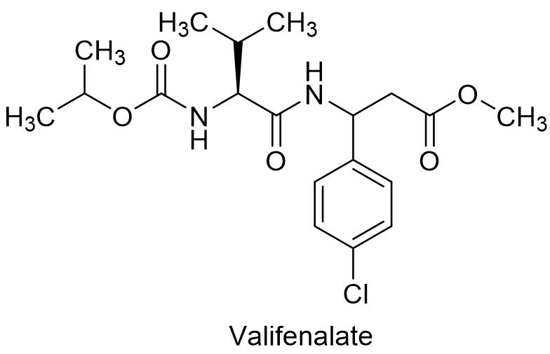 环氟菌胺作用机理有待进一步明确,研究结果表明其能够通过抑制白粉病菌中的菌丝分生吸器的形成和生长,及次生菌丝的生长来实现病害防控,对孢子萌发、芽管的延长和附着胞的形成没有抑制作用。环氟菌胺是一种新型白粉病专用杀菌剂,具有优异的保护与治疗活性、持效期长和耐雨水冲刷,与目前市场上广泛使用的杀菌剂无交互抗性,可用于草莓、黄瓜、西瓜、茄子、辣椒、苹果、葡萄和小麦等多种作物白粉病的防控[10]。日本曹达公司具有优先权的化合物专利是JP1994334497,在国内登记了98%环氟菌胺原药,龙等化学登记的11%环氟菌胺·戊唑醇悬浮剂,用于防治小麦锈病,活性成分用量33~66 g/hm2。1.10 缬菌胺缬菌胺是意大利意赛格发现的含氨基酸的酰胺类杀菌剂,英文通用名:Valifenalate,CAS登记号:283159-90-0,分子式:C19H27ClN2O5,相对分子质量:398.88,化学结构式如下: