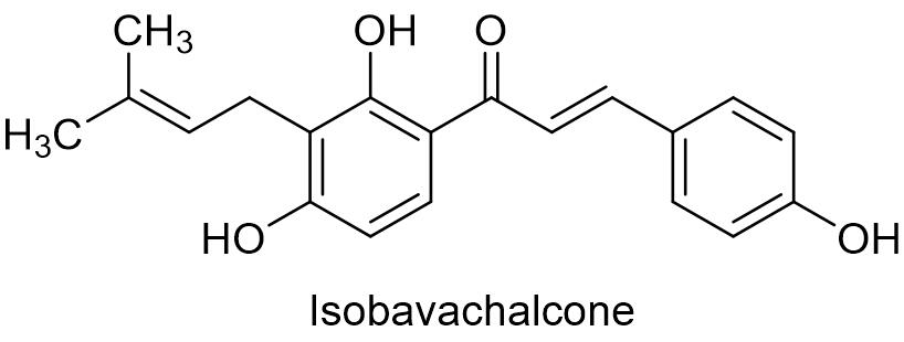互生叶白千层提取物的活性物质是萜烯醇,作用机制是让细胞破裂,斯托克顿(以色列)有限公司登记了互生叶白千层提取物的40.2%母液和互生叶白千层提取物9%乳油,其乳油用于防治番茄早疫病和草莓白粉病,制剂用量67~100 mL/亩。1.14 补骨脂种子提取物补骨脂种子提取物中的杀菌活性物质是苯丙烯菌酮,补骨脂种子提取物英文名称:Fructus psoraleae extract,苯丙烯菌酮英文通用名:Isobavachalcone,CAS登记号:20784-50-3,分子式:C20H20O4,相对分子质量:324.37,化学结构式如下: